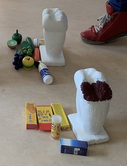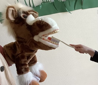 In Kooperation mit einer Zahnarztpraxis werden die Kinder spielerisch über Zahnpflege und zahngesunde Erhährung aufgeklärt. Unterstützung erhalten sie von der Handpuppe "Hugo".