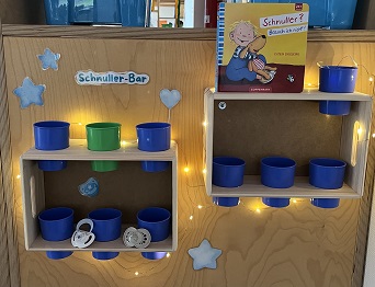 Seit August 2023 betreuen wir Kinder im Alter ab 4 Monaten. Die "Schnuller-Bar" in der U3-Gruppe ist eine große Hilfe für die Jüngsten. Den Blick auf das Vertraute haben zu können, verschafft den Kleinsten Sicherheit und Orientierung im Kita - Alltag.
